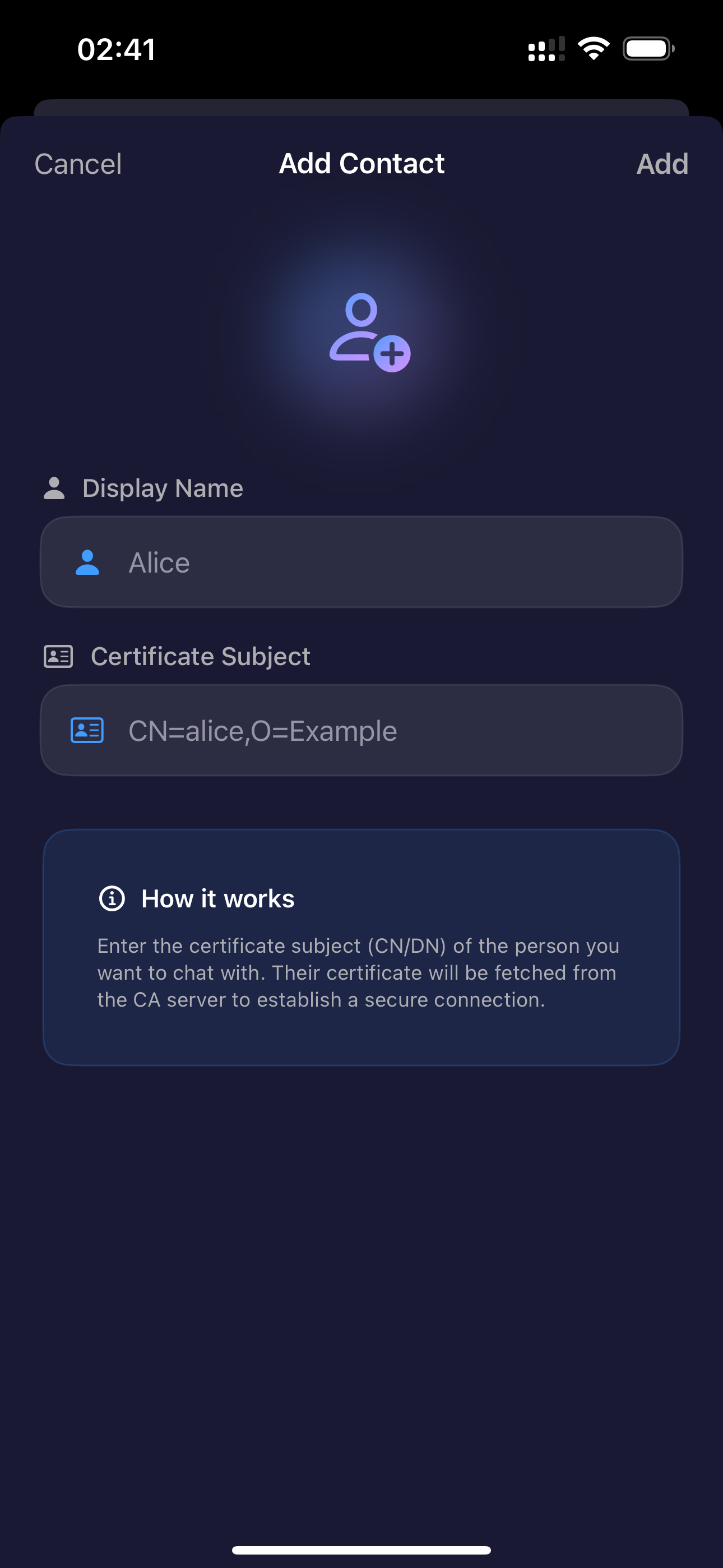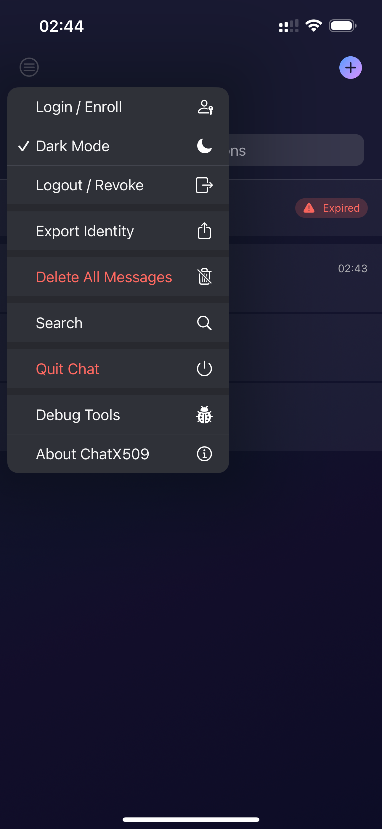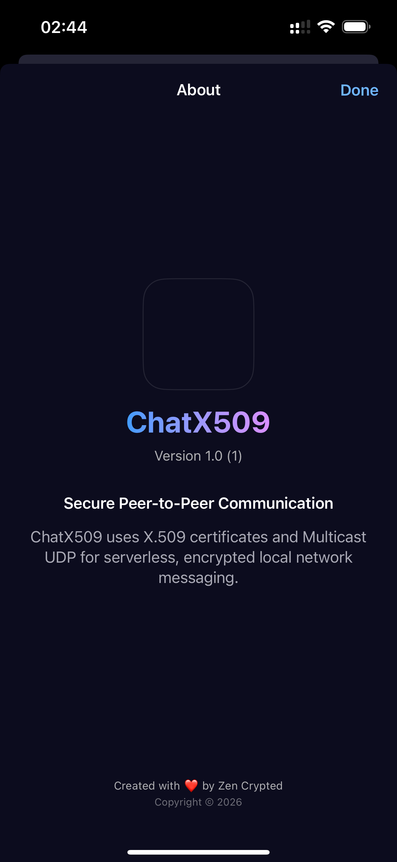 Chat X.509 Protocol v1 описаний в репозиторії MESSAGE клієнта і визначає три конверти для маршрутизаціх системних повідомлень Authority, Message, і Ack (з відкритими заголовками), що передаються по UDP мультікаст. Всередині Authority містяться X.509 сертифікати, і коли клієнти домовляються про спілкування, передаються пари Message з CMS конвертом і квитанція про доставку Acknowledgement з номером Message.id. Кожен термінал виступає кореневим CA.